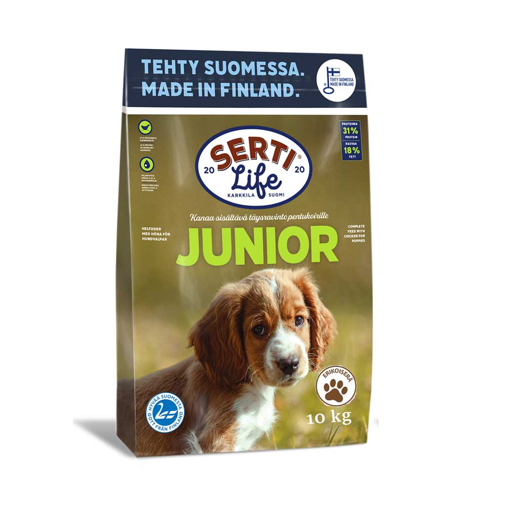 SertiLife Junior on kasvaville koiranpennuille suunniteltu täysravinto, joka täyttää pennun ravitsemukselliset tarpeet ja tukee laadukkailla raaka-aine valinnoillaan tasapainoista kasvua ja ruoansulatuskanavan toimintaa. Energiapitoinen Junior sisältää hyvin sulavaa kananrasvaa ja laadukasta siipikarjan valkuaista kasvavan pennun tarpeisiin. Laadukkaan raaka-ainepohjan ja valmistustekniikan ansiosta Junior sisältää runsaasti välttämättömiä omega-6 ja omega-3 rasvahappoja. Ruoan sisältämät kuidut tukevat ruoansulatuskanavan ja suoliston mikrobiston toimintaa. SertiLife Junior sisältää mannaani-oligosakkaridi prebioottia, yucca-uutetta sekä karpaloa.